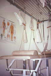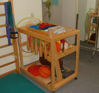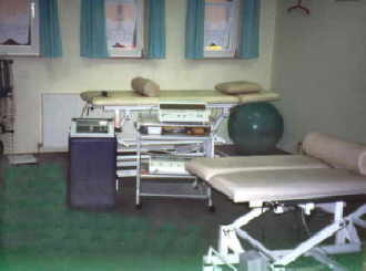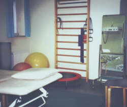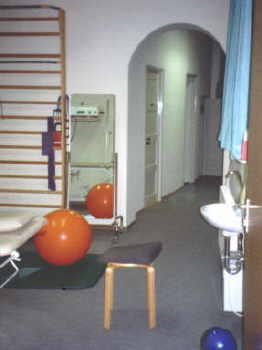 mit Korrekturspiegel, Behandlungsbank, diversen Gymnastikgeräten, Infrarotstrahler und Sprossenwand.